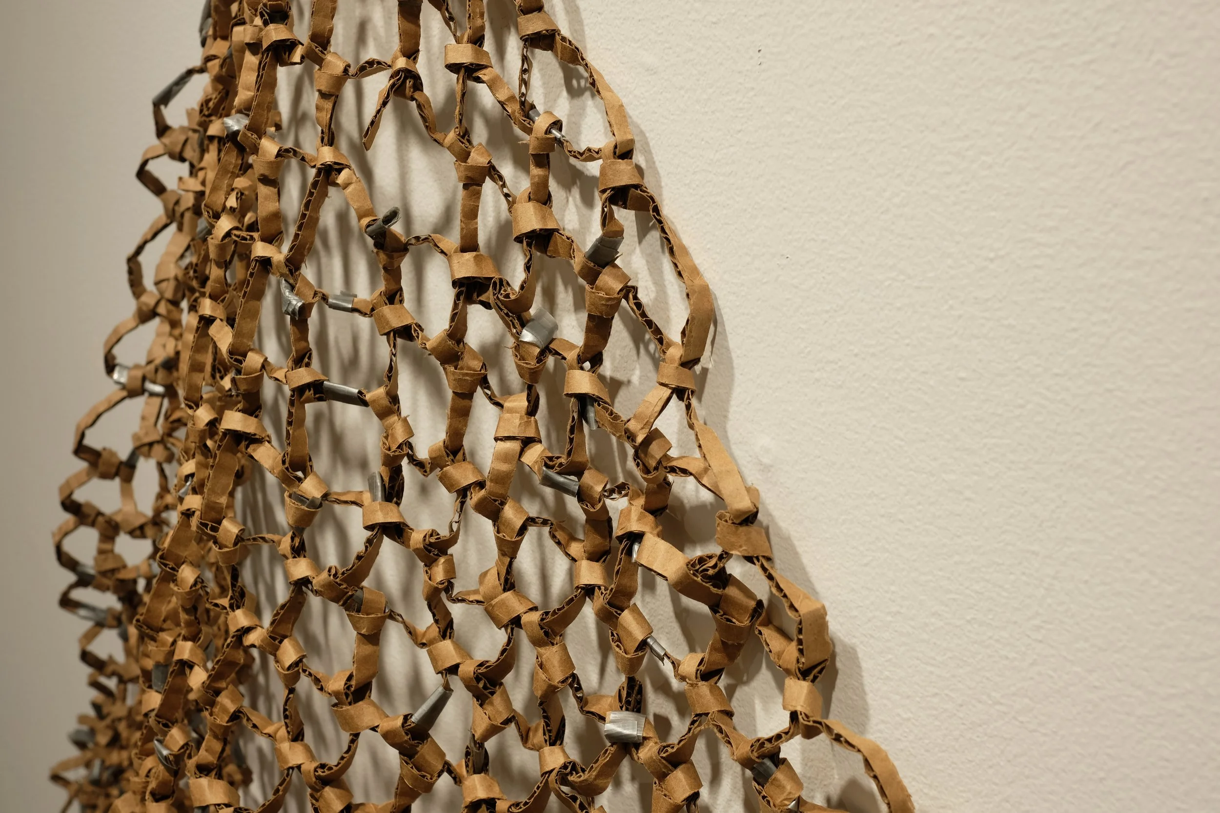 Handle with Care takes the form of a handwoven cardboard net held by a cast of my hand. Cardboard carries the language of movement: of distances crossed, of balikbayan boxes sent and received. As a carefully woven, porous structure, it gestures toward the systems of care that tether families across borders.