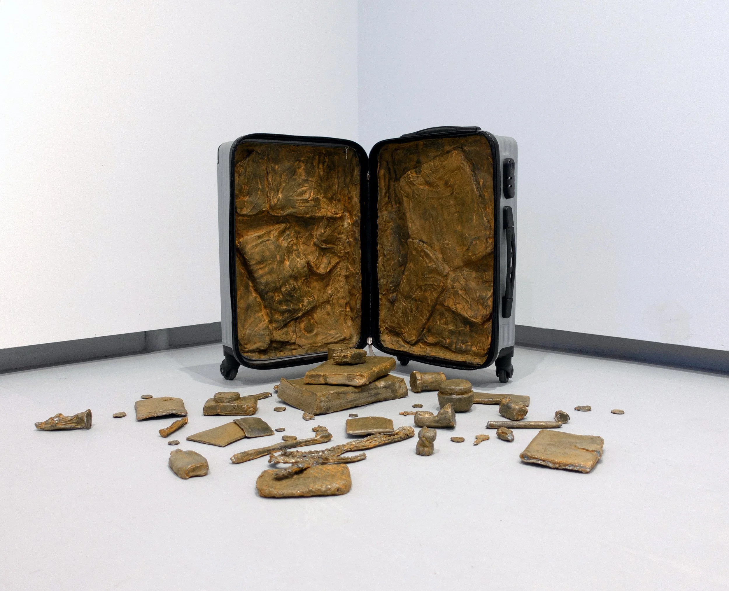 Materials: Graphite powder, dry pigment, acrylic, cast paper clay, and found luggage