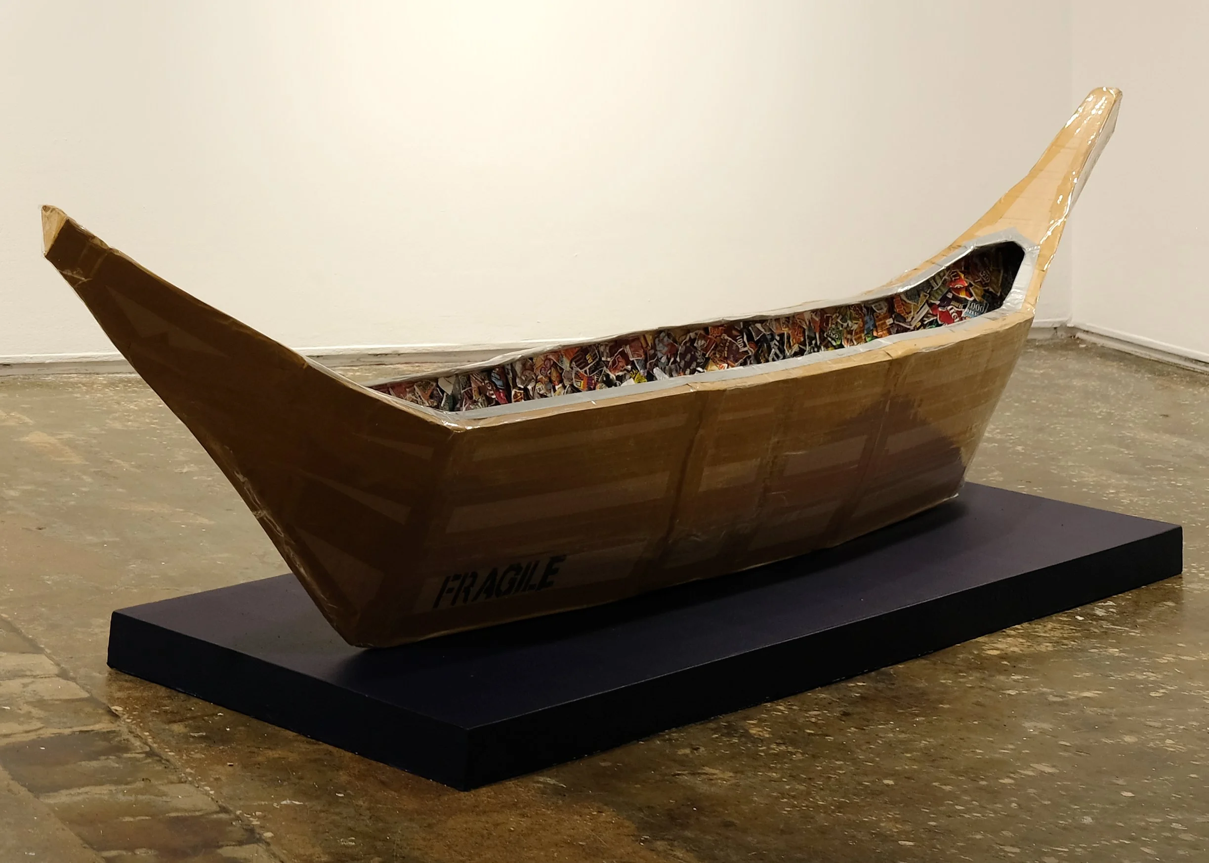 Mga Biyahe is a makeshift bangka made from reclaimed cardboard, tape, and used lottery scratchers.