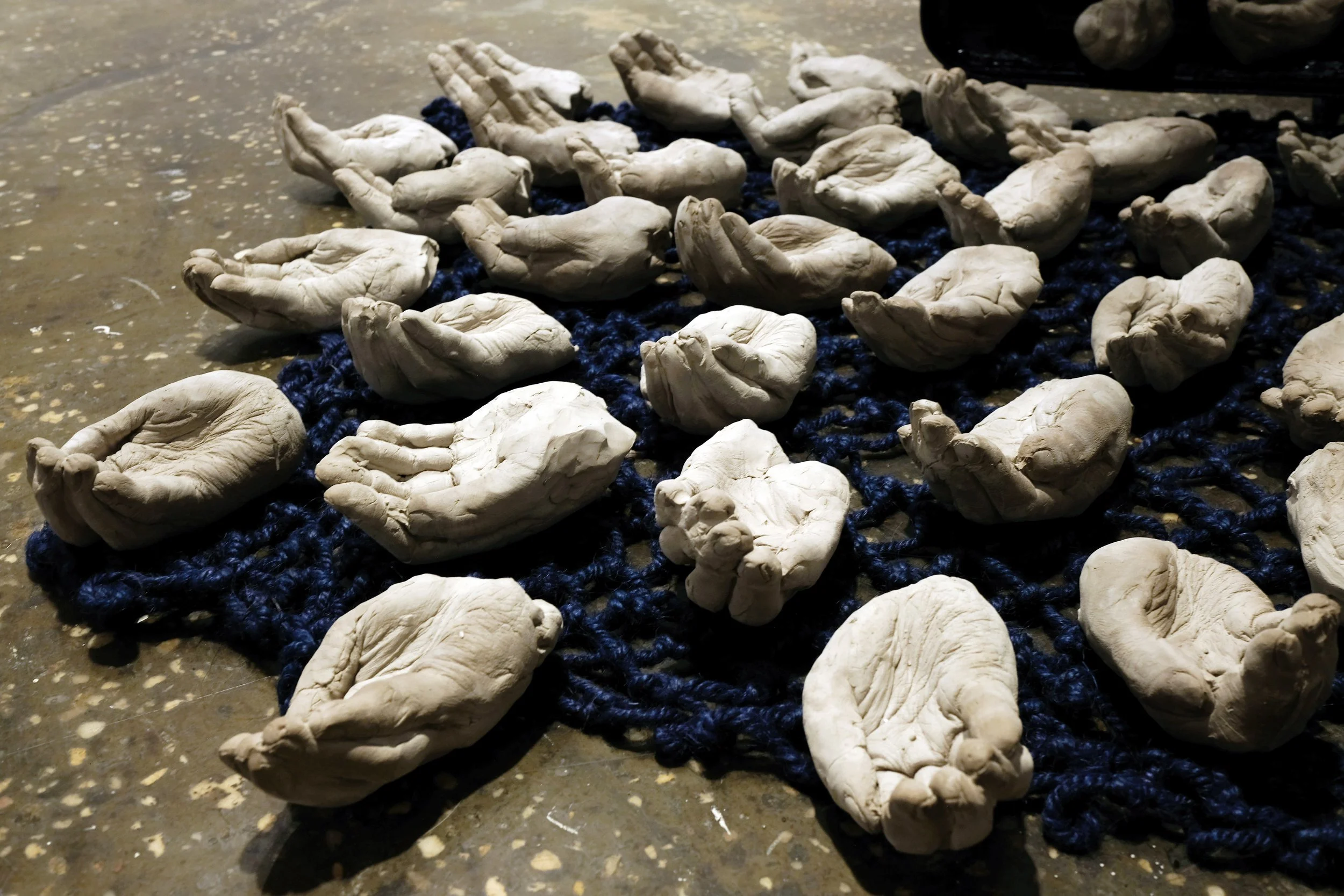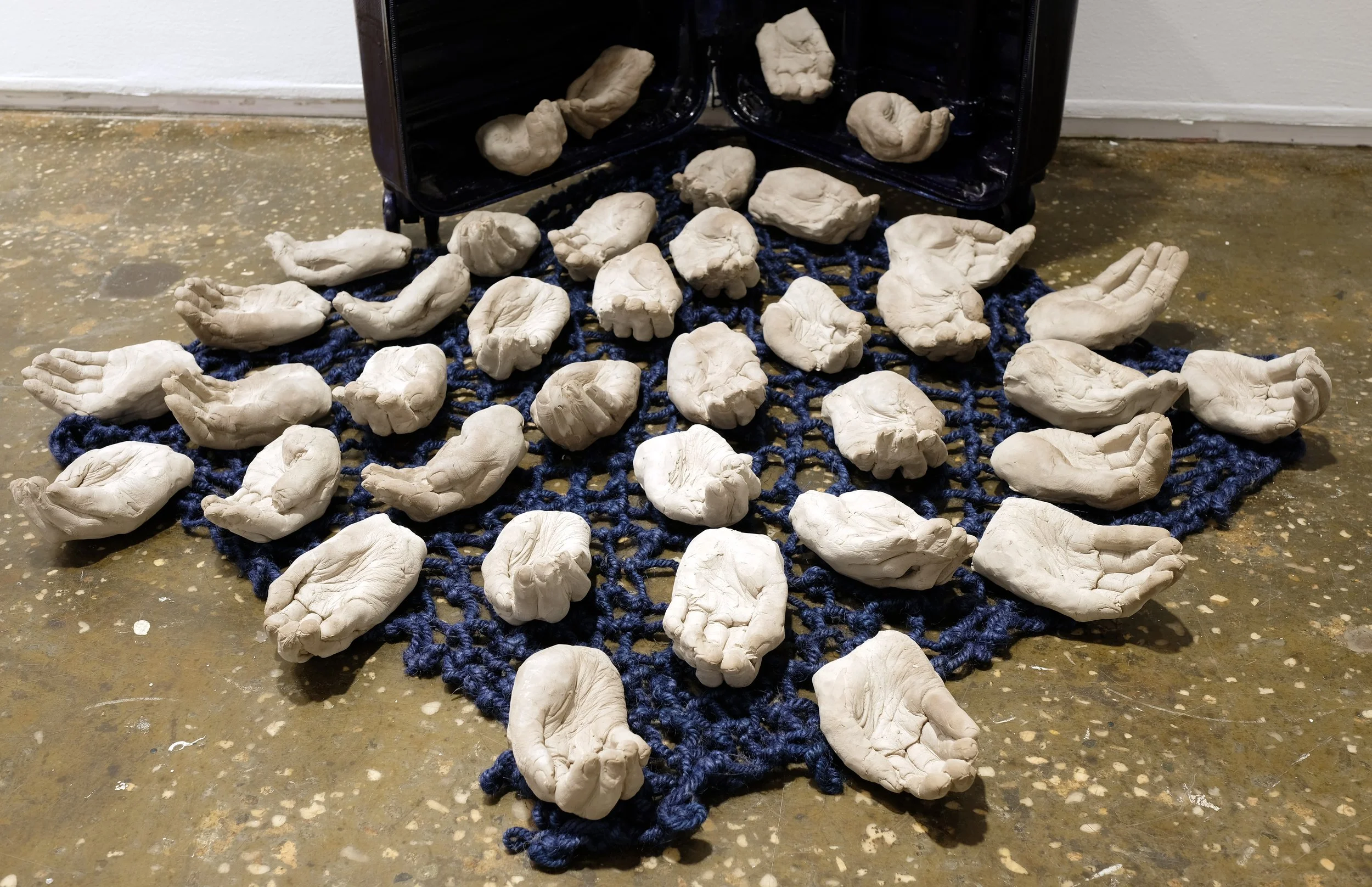 Materials: Found luggage, acrylic paint, artist’s handwoven net with indigo dye, and 38 air-dry clay casts of artist’s hand