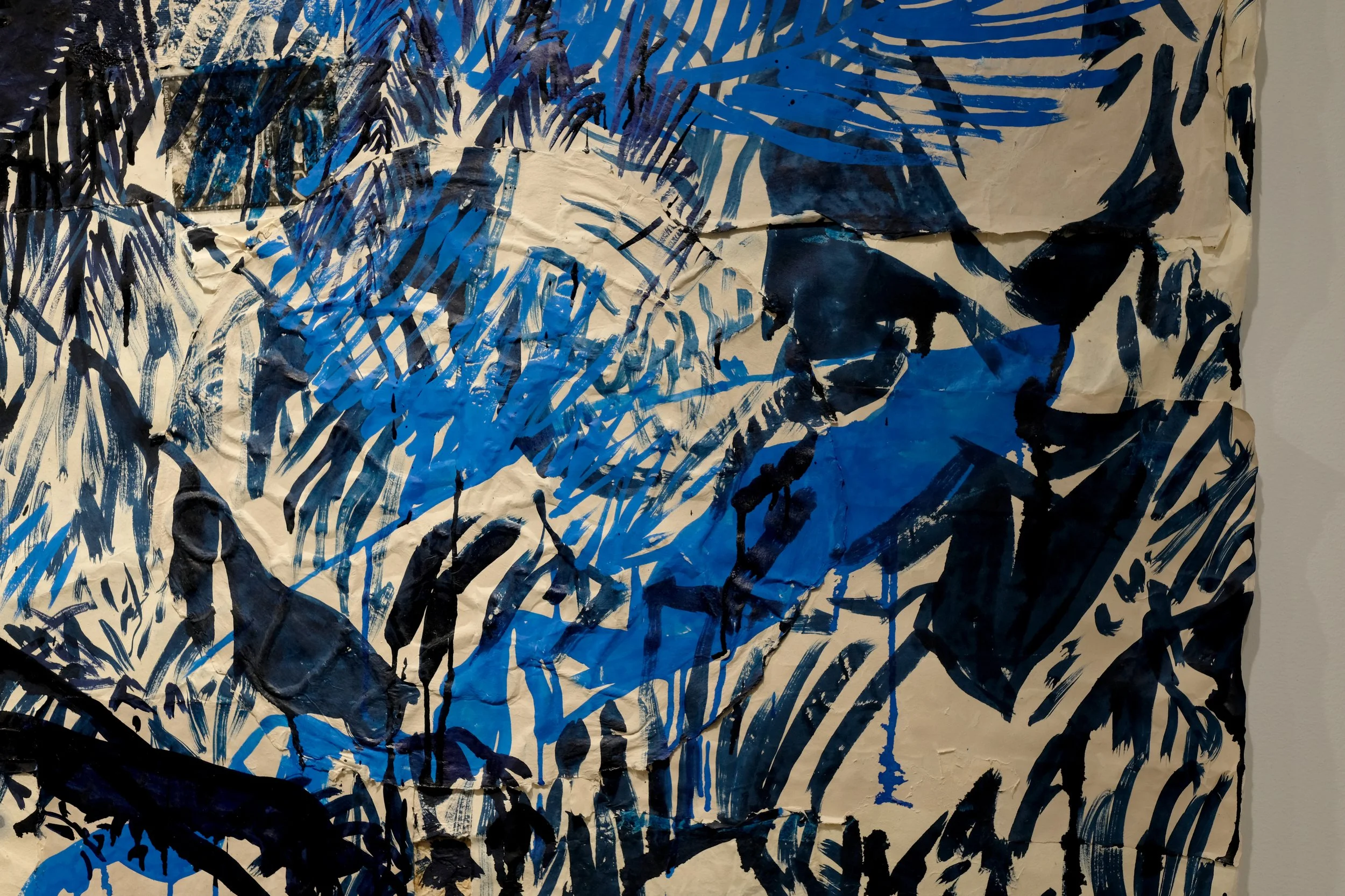 Materials: Conte crayon, colored pencil, acrylic, ink, and image transfer on handmade paper (lottery scratchers, handwoven net, cardboard pulp, dried banana leaves, abaca, gampi) mounted on unstretched canvas